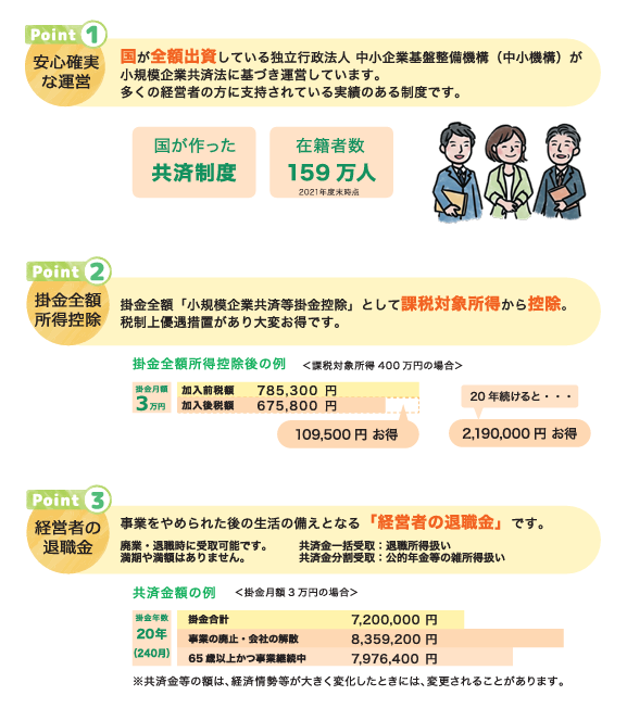 また、低金利の貸付制度や破産時の差し押さえ禁止 など、経営者にとって大きなメリットがたくさんあります。