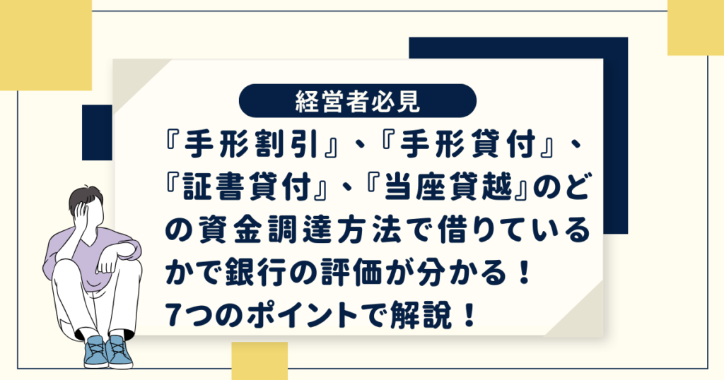 実は、銀行の評価を知るための手がかりは、どの資金調達方法を利用しているかを確認することから始まります。「手形割引」「手形貸付」「証書貸付」「当座貸越」──これらの融資形態の違いを理解することで、銀行があなたの会社をどのように見ているのかが分かるのです。