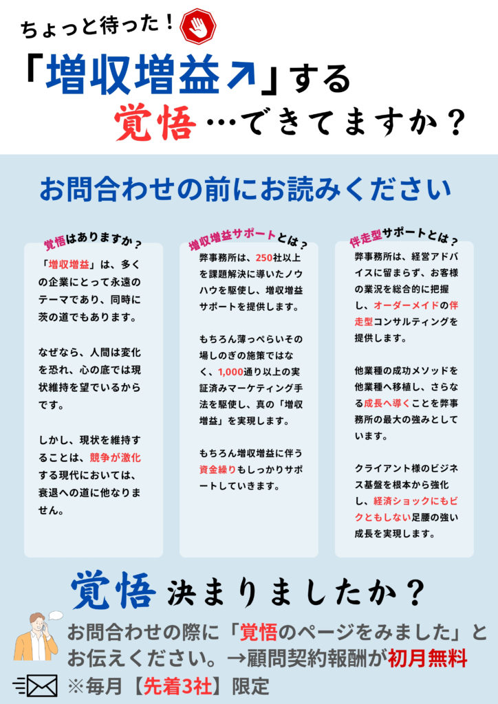 | 顧問契約【成果型】 ※審査があります ※10社限定 | ・1,000通り以上のマーケティング手法を 駆使した完全オーダーメイドの 増収増益コンサルティング ・資金繰り改善コンサルティング ・会議・重要商談等の出席 | 面談相談(月1回~) 電話相談(随時~) メール相談(制限なし) Zoom相談(随時) | 3~30万円 | 成果報酬の基準については、 審査の際にクライアント様と 協議 | ①増収増益 ②赤字→黒字転換 ③債務超過→資産超過 ④資金繰り改善 ⑤経済ショックに ビクともしない 経営基盤確立 |
